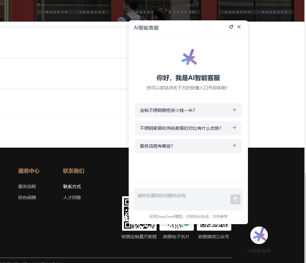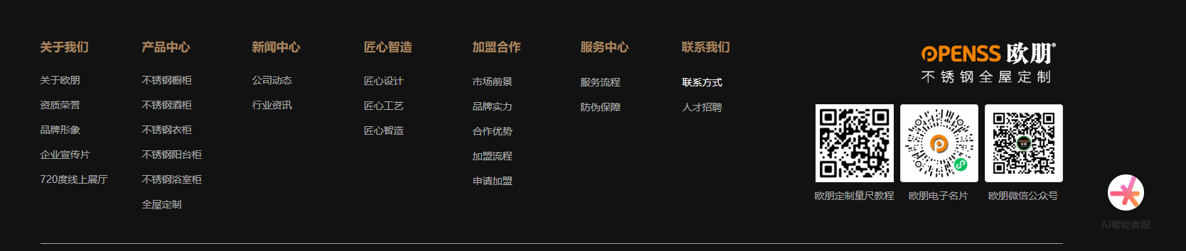 官网:联系我们页面+AI在线客服+底部联系方式